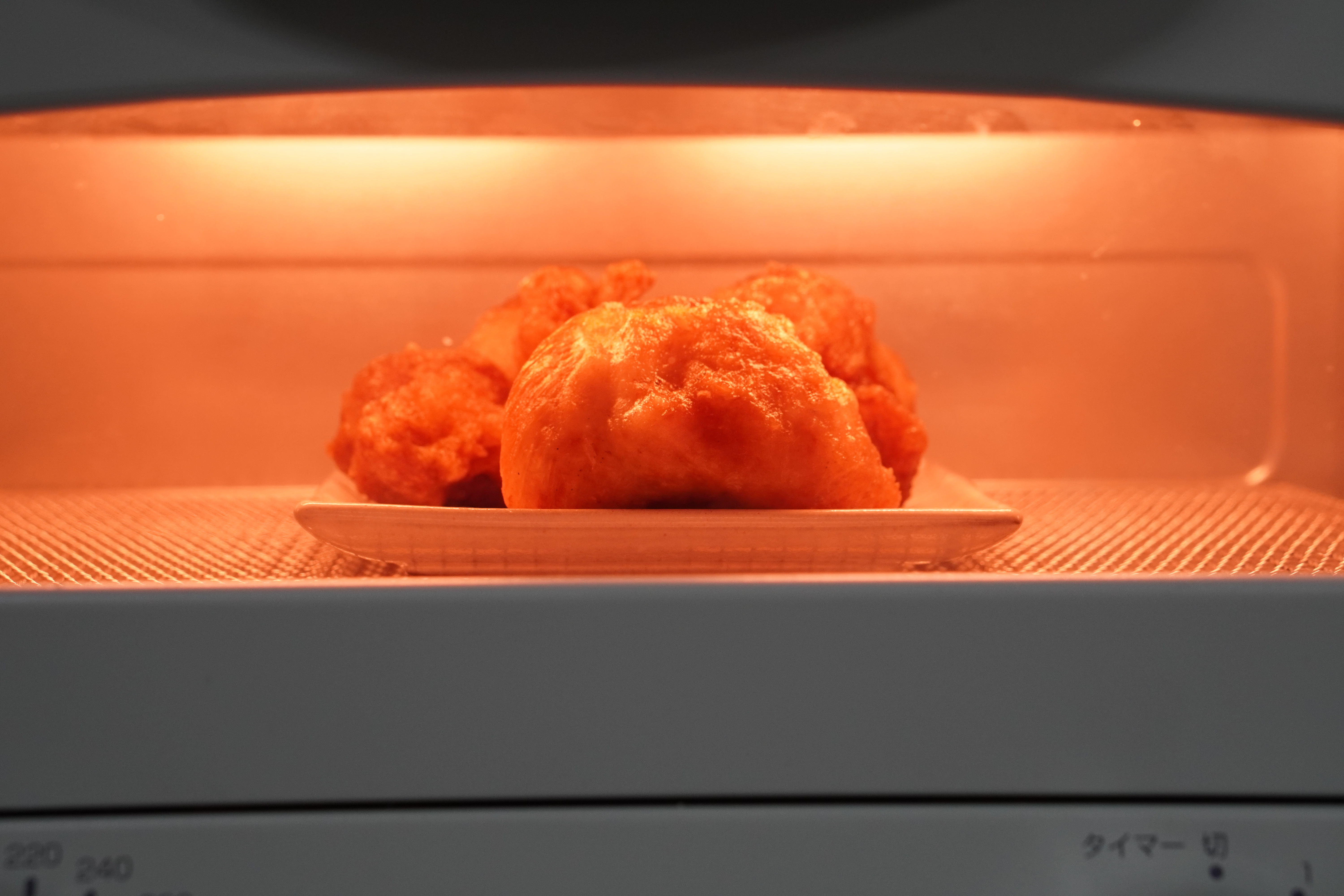 冷凍庫から出した後は、電子レンジで簡単調理。オーブントースターで仕上げると更にカリっと感が増します。